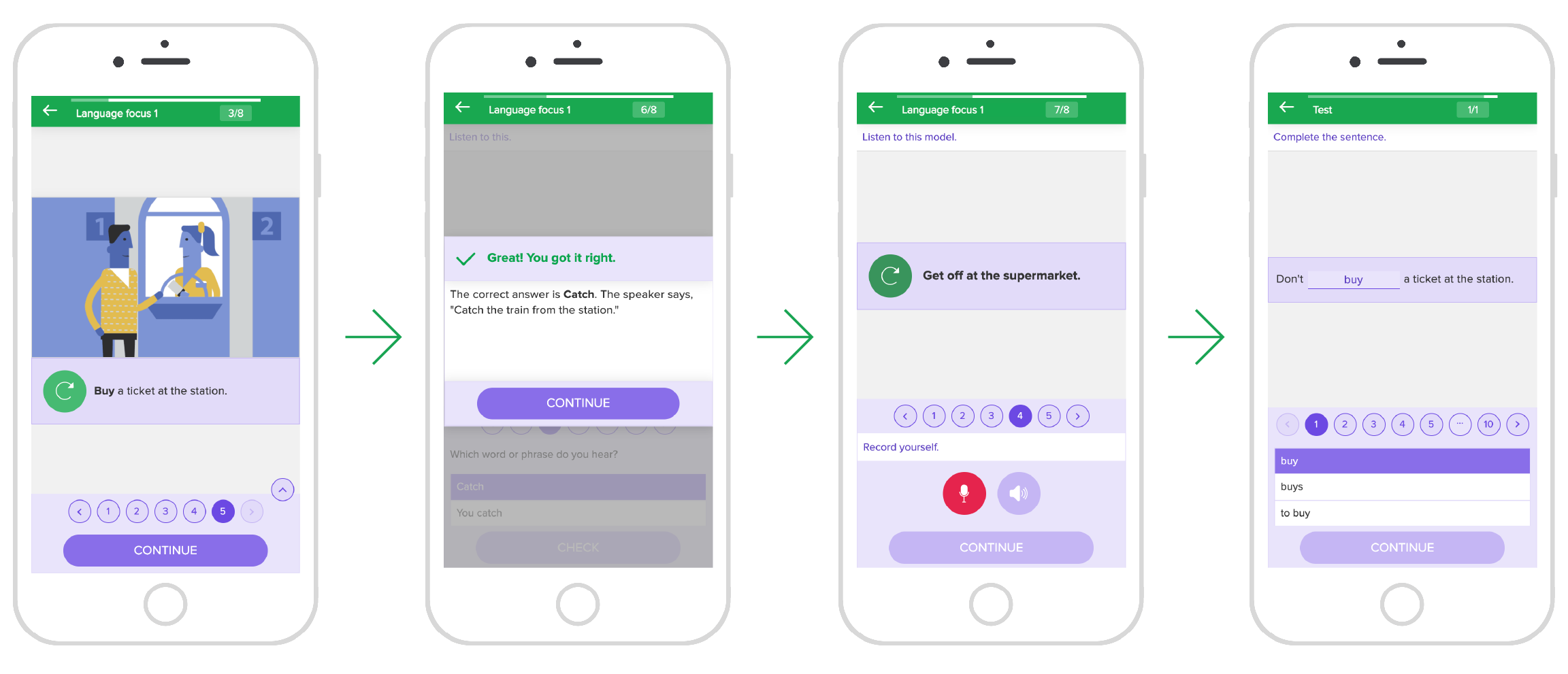 After every four lessons, learners can put what they’ve learned into practice through simple role-plays that simulate common survival communication situations. Short, focused pronunciation and speaking drills let learners record themselves and train stress and intonation on core vocabulary.